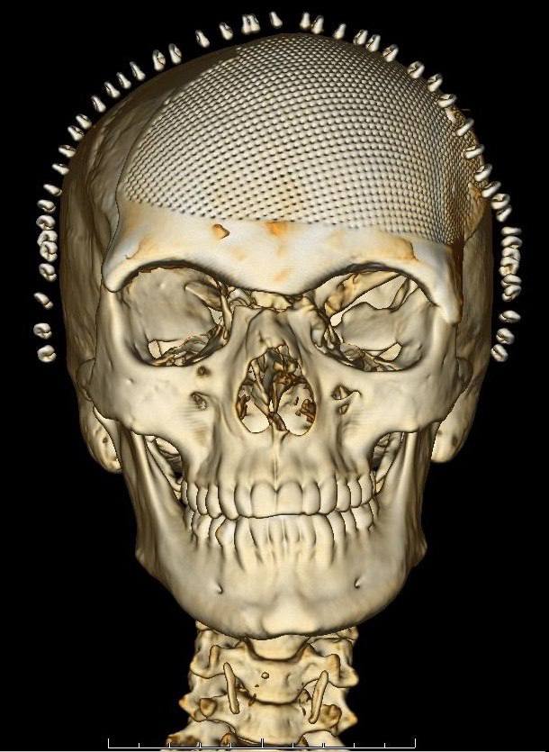 Второй этап операции был назначен на февраль 2025 года. Во время него было необходимо удалить остаточную часть фиброзной дисплазии в лобной области слева и справа, а также удалить временную стандартную титановую пластину и провести краниопластику сформированного дефекта при помощи индивидуальной 3D-пластины.