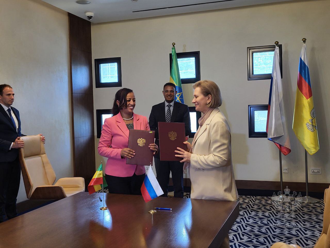 Также Россия поможет Эфиопии организовать санитарно-эпидемиологический контроль и работу в очагах инфекционных и паразитарных болезней. Со стороны РФ документ подписала Руководитель Роспотребнадзора Анна Попова, со стороны Эфиопии — Министр здравоохранения Мекдес Даба.